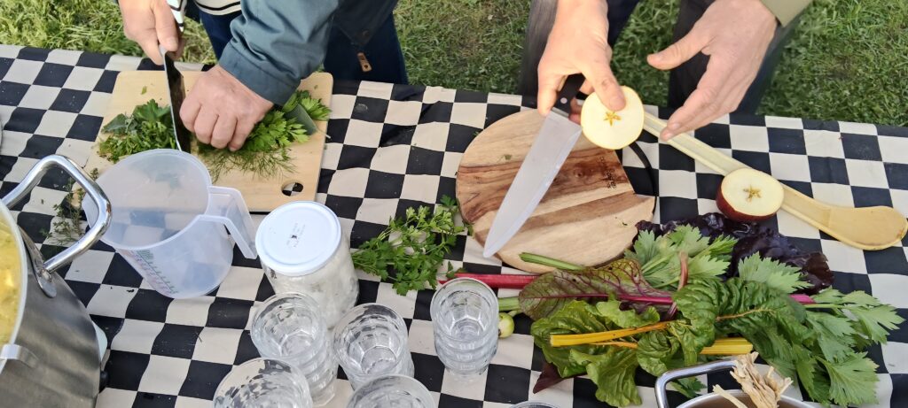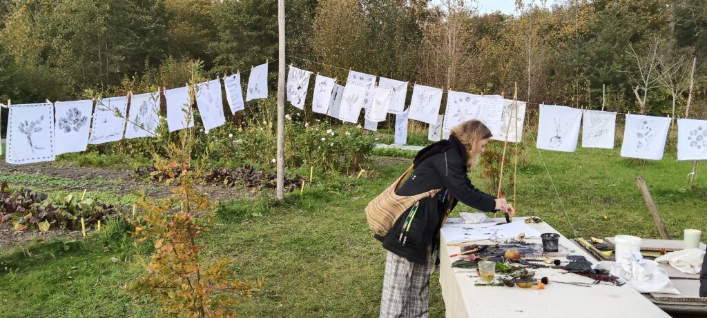 Voor de kunstroute bij ecodorp Bergen wilden we de moestuin waar het dorp uit eet in het zonnetje zetten. We hebben de bezoekers aan de route de tuin in gestuurd om te kijken wat er allemaal groeit en bloeit en wat lekkers of wat moois te plukken. Samen hebben we daarmee buiten (en bij nat weer in de kas) moestuinsoep gemaakt en gegeten, terwijl we katoenen doeken hebben geprint om al het moois te vereeuwigen dat in de moestuin te vinden was. Aan het eind van de rit hingen er waslijnen vol unieke doeken, die de hele week tijdens openingstijden buiten in de moestuin te zien waren.